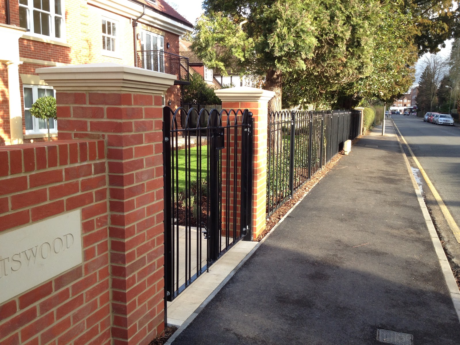 Abbotswood, Gregories Road, Beaconsfield, up market development of luxury apartments in landscaped grounds now completed. Tree and shrub planting is maturing quickly with wildflower turf incorporated into final design. Design features attractive pergola, gazebo, attractive Blanc de Bierge paving and wrought iron hooped railings with brick pillars.