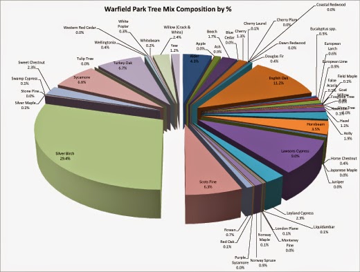We have just completed a safety survey of 2,440 trees throughout the Warfield Park settlement close to Ascot and Bracknell. We were asked to survey the trees by the park management to assess their condition and to proscribe recommended treeworks and long term management as well as obtaining their root protection areas. We were assisted by the many park residents and the management staff in this survey work. The survey schedules and plans will provide the basis for a long term management plan and for the development of new low impact building projects within the park area that lies over several hectares of land. We have shown some images below of the park and some typical trees: