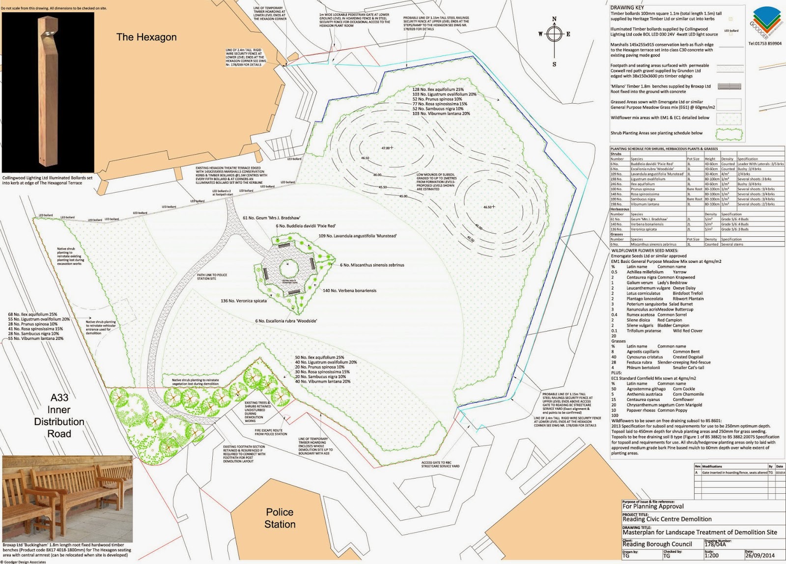 We are currently working on the redevelopment of the Reading Civic centre site and planning applications have been submitted for new railing details for the upper level podium and we have produce a masterplan design for the temporary public realm for the demolished site adjacent to the Hexagon theatre. Here are some images below of this scheme that is now being considered by Reading Borough Council:
